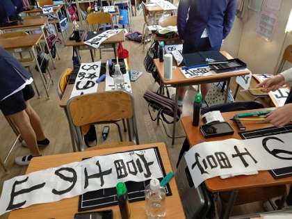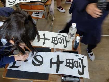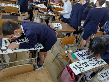 書初めをしています。みんな上手にできました。