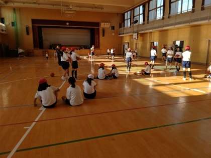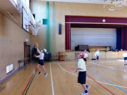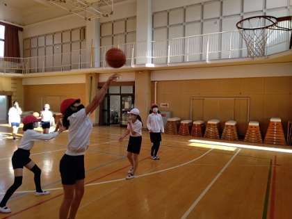 体育館でバスケットボールのパスからシュートの練習をしています。