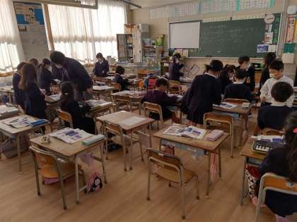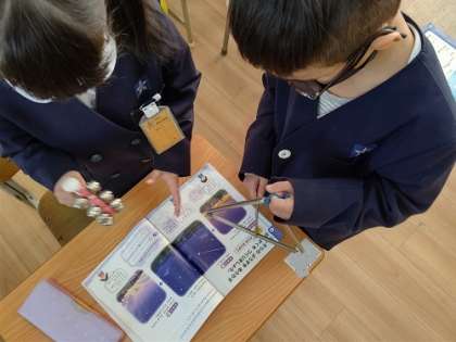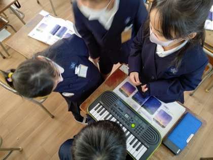 「ほしぞらのようすをあらわすおんがくをつくりましょう。」という内容で、いろいろな楽器を使って、相談しながら考えています。