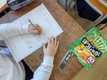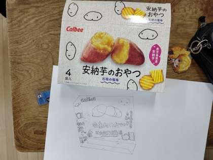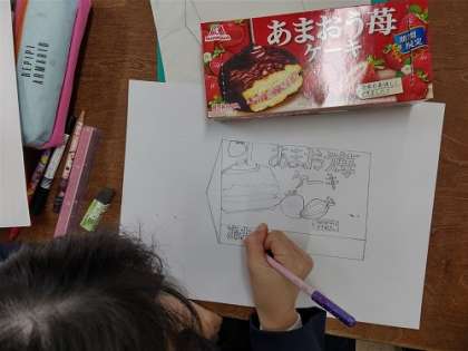 お菓子の箱の模写をしています。