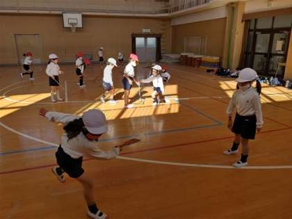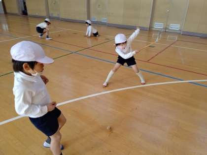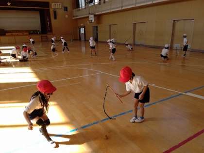 体育館で、こま回しと羽根つきをしました。