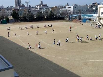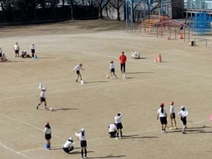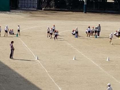 運動場でサッカーのドリブルの練習です。