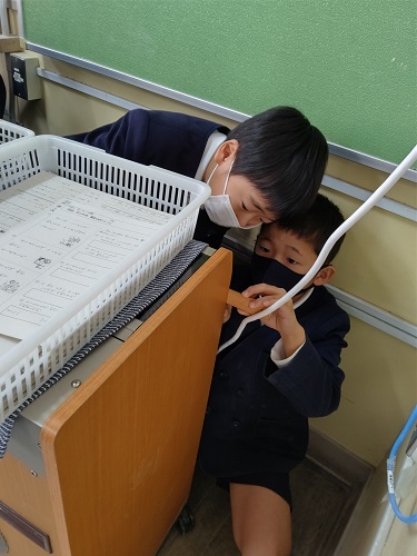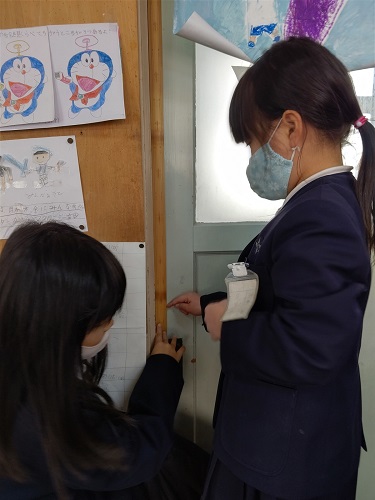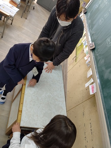 「いろいろなものや、ばしょの長さをよそうしてから、はかりましょう。」の学習です。1mの竹ものさしを使います。