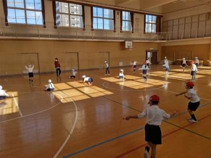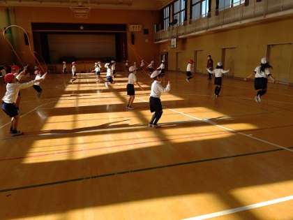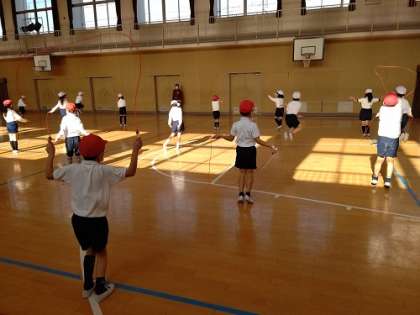 体育館で、なわとびのあやとびの練習をしています。
