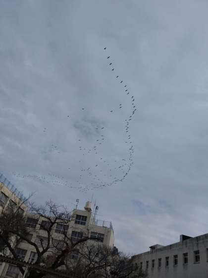 渡り鳥の群れが飛んでいくのを子どもたちが見つけました。