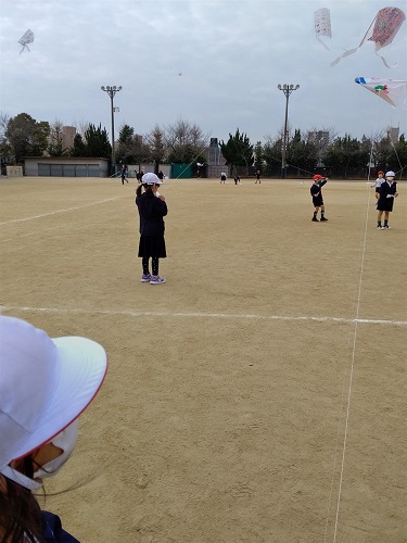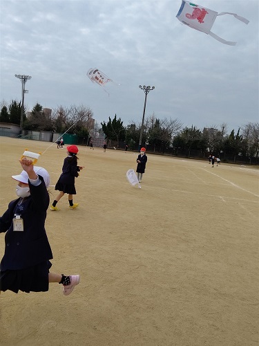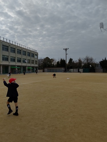 曇っていますが、作ったたこをあげています。寒いけど頑張ってます。