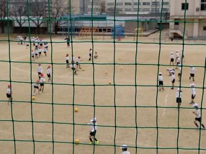 運動場でサッカーのボールパスの練習と50mのタイムを計っています。
