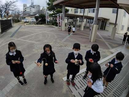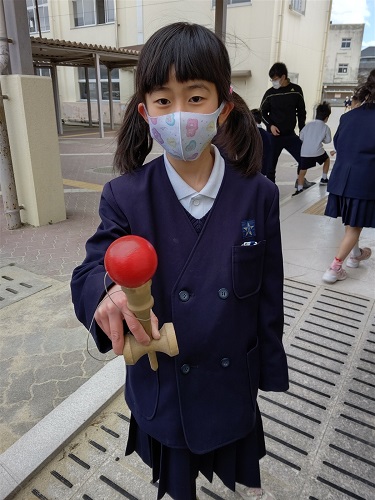 けん玉とこま回しを練習しました。こま回しはとても難しいです。