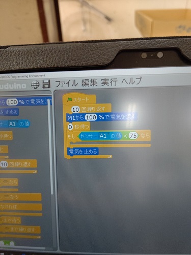 プログラミングの授業で、「光センサーと人感センサー」の学習をしています。明るさの変化・人の近づきをセンサーで感知し、豆電球を点灯・消灯させるフローチャートを考えています。