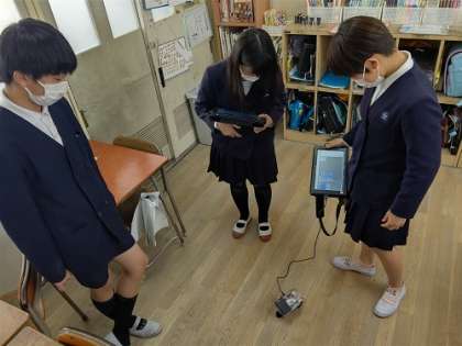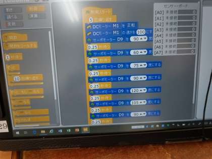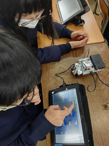 プログラミングの授業で、「ロボットカー」の学習をしています。スタディーノのフローチャート型のプログラミングソフトを用いて、「DCモーターやサーボモーターの制御」の学習をしました。