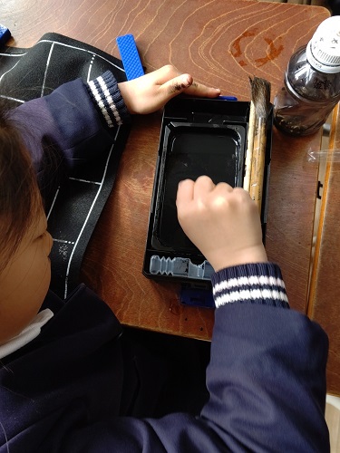 書写で、がんばって硯で墨を磨っています。