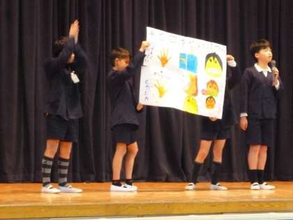 今はやりの♪ラッスンゴレライ♪のリズムに合わせての披露は見ている児童に大うけでした。