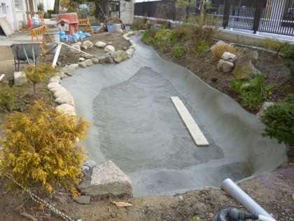 以前は「シート張り」だった水底を、コンクリートでしっかり補修、この後、さらに防水加工を行います。