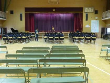 まだ、寒い寒い講堂の前に、6年生が着席するだけのパイプいす。