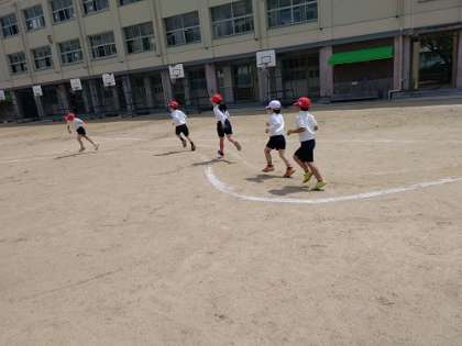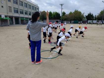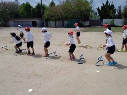運動場で「輪っかの上で飛び跳ねてから短距離のダッシュ」「ミニハードル」「S字走」を繰り返し、練習しています。
