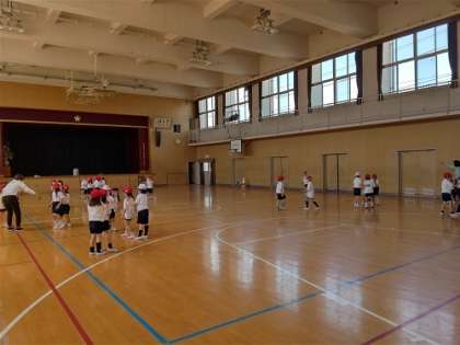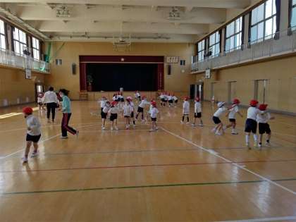 体育館では、「じゃんけんれっしゃ」の曲をききながら、汽車のれんけつをつくりました。