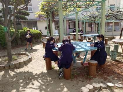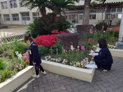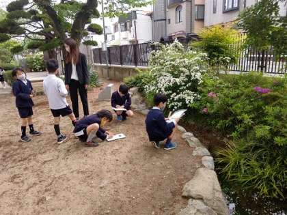 校庭を散策して、「発見カード」に見つけた生き物や花などを記録しています。池の鯉・花壇のチューリップ・ふじ棚のフジの花・ツツジの花・ビオトープの植物などを観察していました。