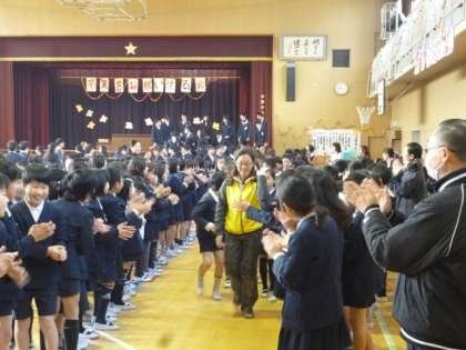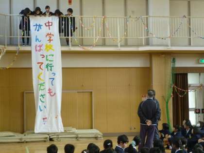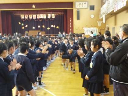 2・3枚目:在校生の大きな拍手につつまれ、6年生の退場