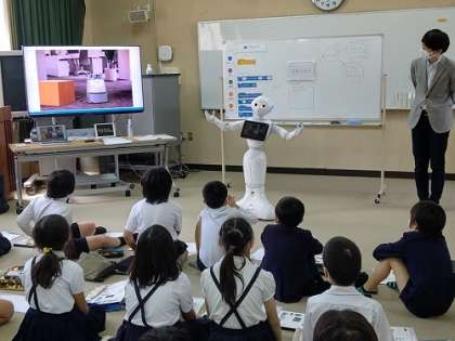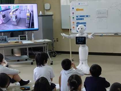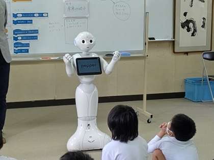 ペッパーが、「人間とロボットの未来について考えてみよう」と最初の説明をしてくれています。