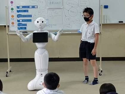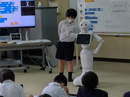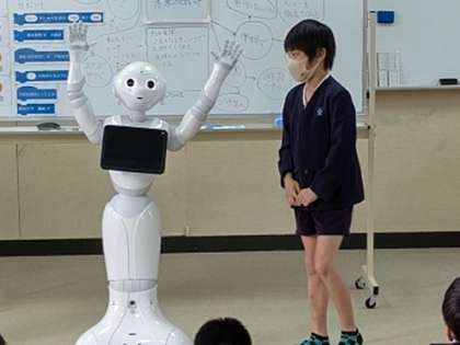子どもたちは、自分のプログラミングした内容をペッパーに転送し、それをペッパーがしゃべって動いて表現しています。