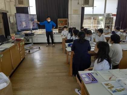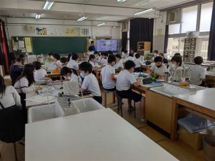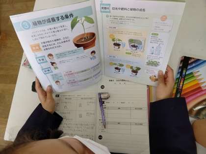 理科室で授業をしています。「植物が成長する条件」の学習をしています。