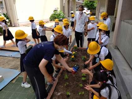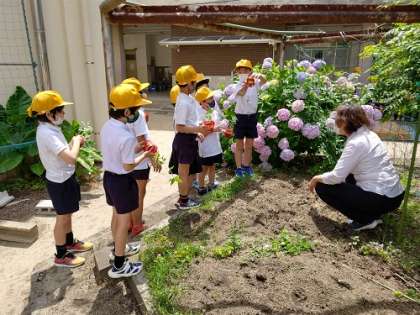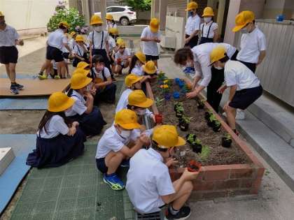 花壇に、種から育てたマリーゴールド、ホウセンカ、ヒマワリを植えています。