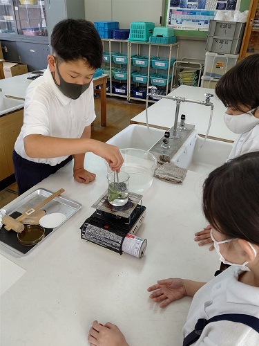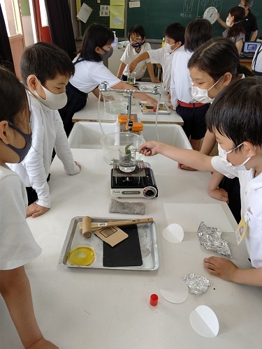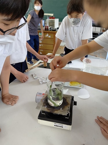 理科の実験をしています。葉っぱのデンプンのヨウ素溶液での反応を確認します。