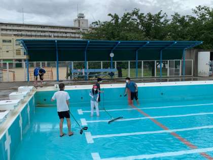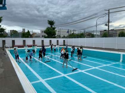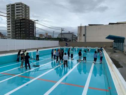 みんなで力を合わせてプールの底やプールサイドをきれいにしました。