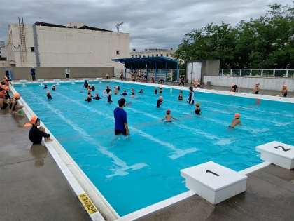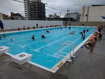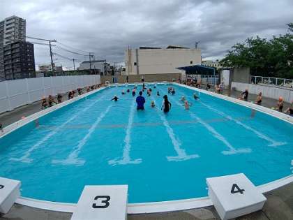プールの授業で、水中の輪っかをどれだけ取れるかをしています。