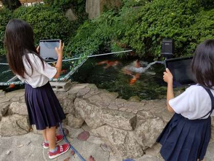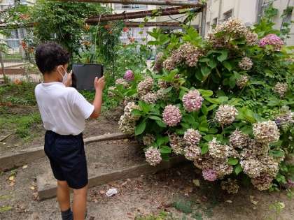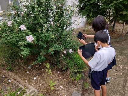春に続いて、校庭の夏の植物や生き物を探しています。Chromebookで写真を撮っています。