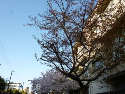 3月後半の暖かさで見事に咲き誇っている校庭の桜。