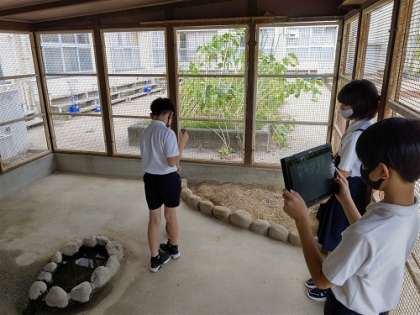 Chromebookで、学校の想い出になる場所を写真に撮っています。