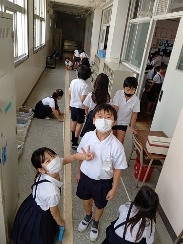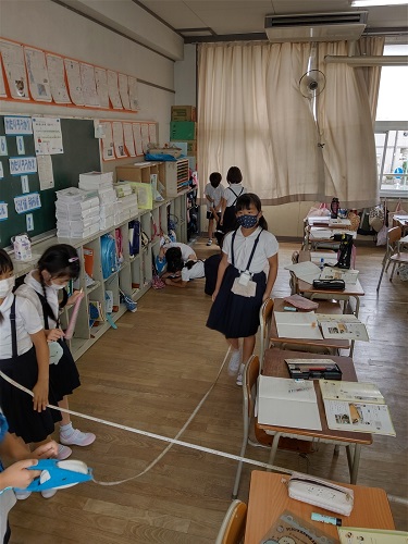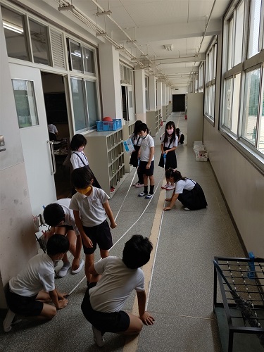 巻き尺を使い、教室や廊下の長さを計る学習をしています。