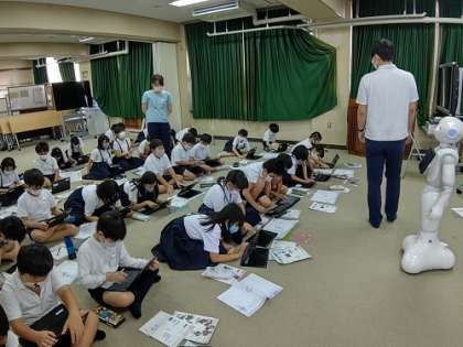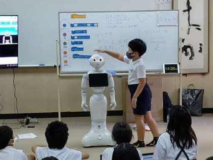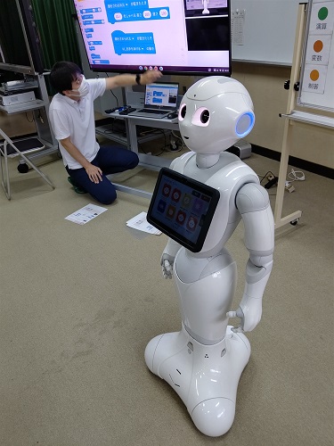 ペッパーの「頭」「右手」「左手」のタッチセンサーを使っています。各センサーにタッチしたら、ペッパーがしゃべったり動いたりするプログラムを考えています。