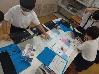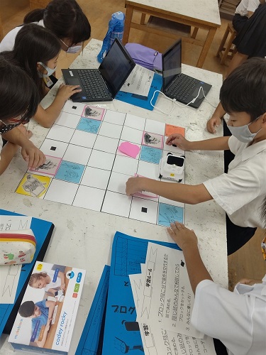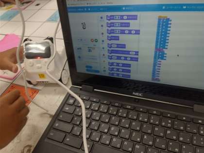 Chromebookを使って、mblockのソフトでプログラミングをしています。code rockyロボットが、コース上のアイテムやお宝をとってゴールするプログラムを考えています。