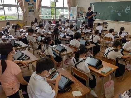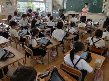 タブレットPCを使って、デジタルドリルの使い方の学習をしています。