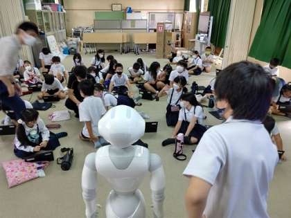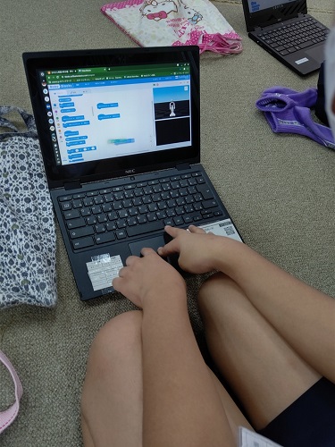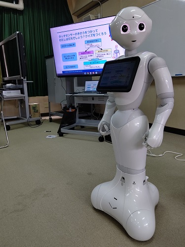 ペッパーのタッチセンサー(頭・右手・左手・足)に触れることで、ペッパーが答えてくれるクイズを作りました。Chromebookを使って、ロボブロックスのソフトでプログラミングをしました。