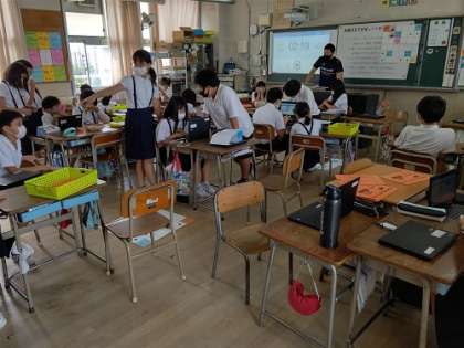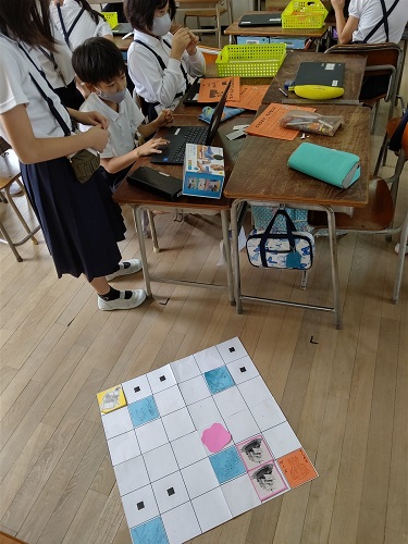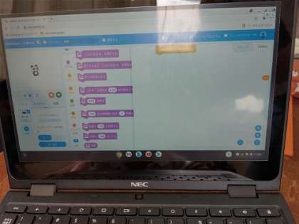 Chromebookを使って、mblockのソフトでプログラミングをしています。code rockyロボットが、コース上のアイテムやお宝をとってゴールするプログラムを考えています。
