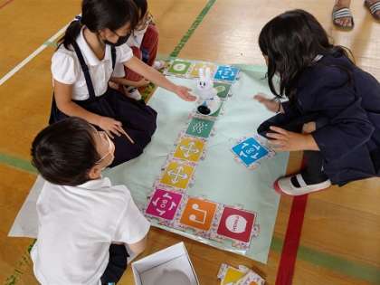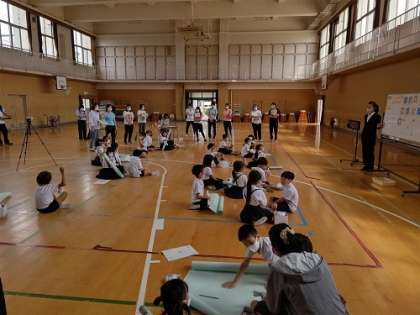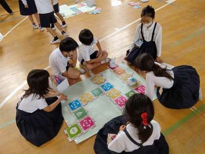3時間目に体育館において、2年生のプログラミング学習の研究授業を行いました。プログラミング学習教材ロボットのアリロを使って学習しています。パネルを並べて、班のみんなで考えた道順でアリロを動かしています。