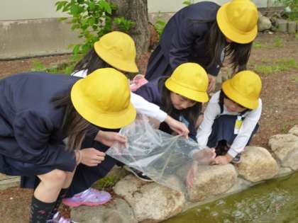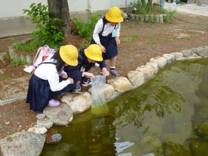 新しくなったビオトープに初めての生体、メダカ100匹を放流しました。