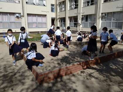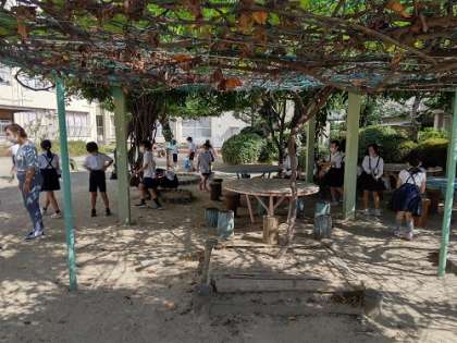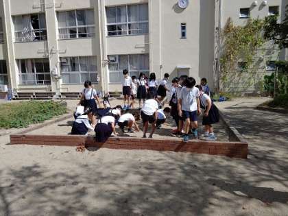 理科で地面の温度を日向と日陰で確認しています。