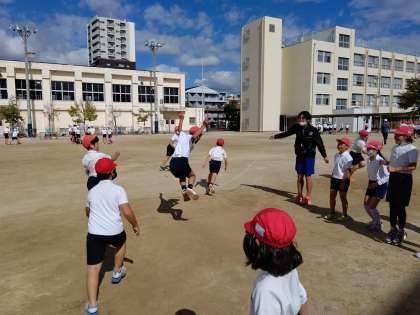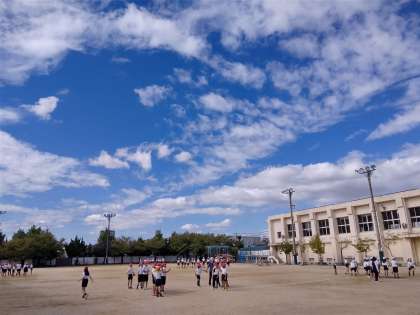 運動場で体育の授業です。大縄跳びの練習をしています。