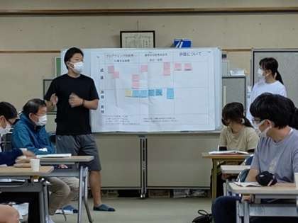 研究授業のあと、多目的室において、研究討議会を行いました。先生は班ごとに分かれて、授業について話し合い、視点別の表に付箋を貼るなどして話し合った内容をまとめ発表しました。大阪市教育センターの指導主事先生に指導講評してもらいました。