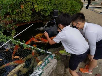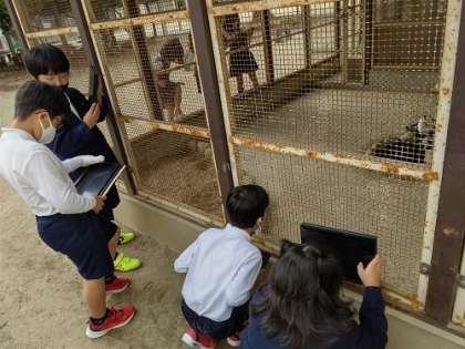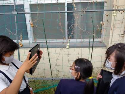 理科でChromebookを使って、校庭の秋の生き物などの写真を撮っています。