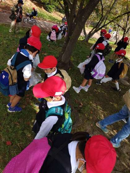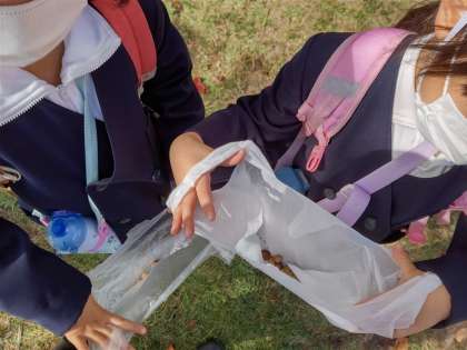 どんぐりをビニール袋に集めています。