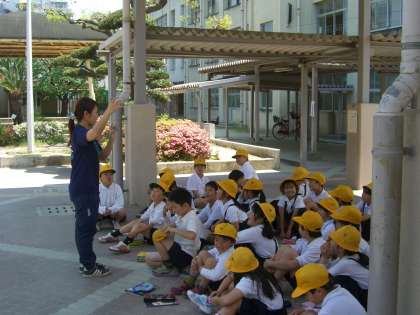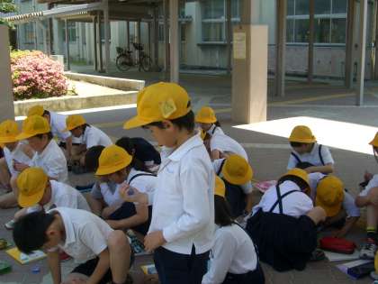 吹き抜ける風がさわやかな日陰では、3年生が社会・理科の学習を行っていました。