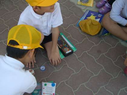 担任の説明を聞いた後、手に手に方位磁針を持った子ども達は、方位磁針の赤い印が止まるのを待って北の方位を確かめていました。