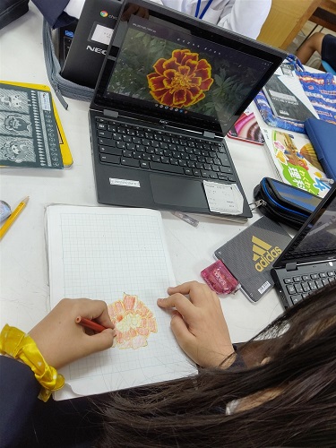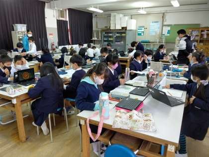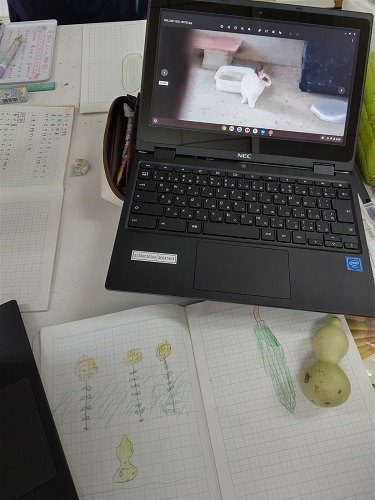 理科でChromebookを使って、校庭の秋の生き物の様子を調べています。