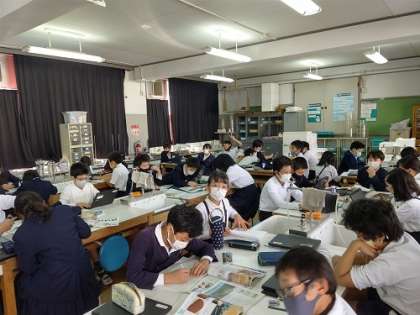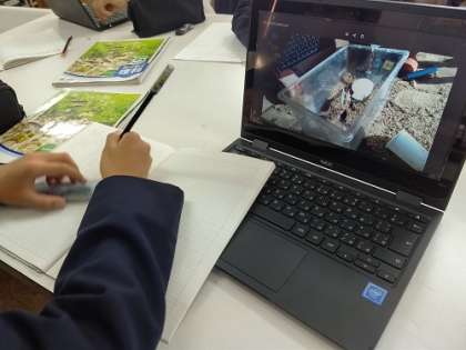 理科で実験をしました。Chromebookを使って、実験の様子を動画で撮影して、それを見ながらレポートにまとめています。