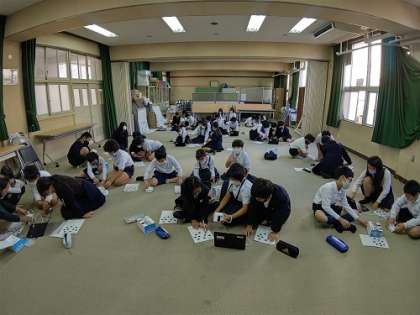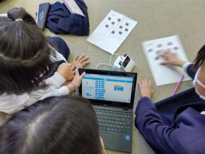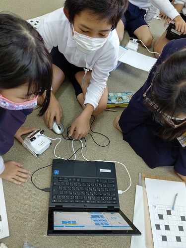 Chromebookを使って、mblockのソフトでプログラミングを行い、code rockyロボットを制御しています。めあてとして「code rockyを動かしてみよう」ということで、マス目のプリントを用いて出発地からGゴールまでのプログラムを考えています。